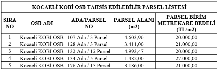 Kocaeli KOBİ Organize Sanayi Bölgesi Arsa Tahsisleri İlanı