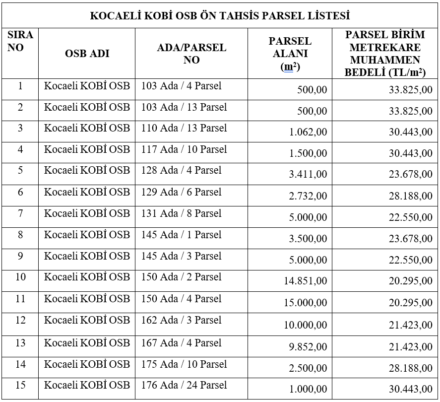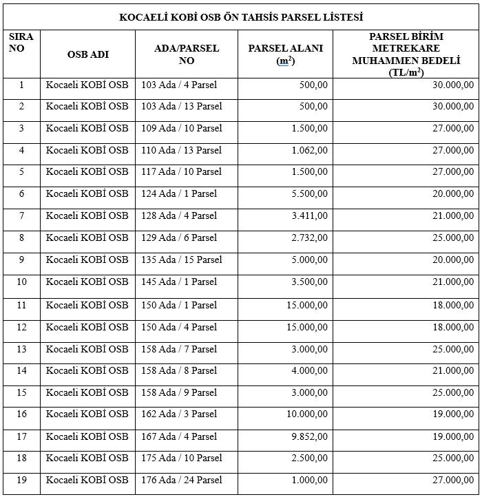 - Bir parsel için birden fazla başvuru olması durumunda ön tahsis işlemi ihale yöntemi uygulanarak yapılacaktır. İhale Kocaeli KOBİ OSB Müteşebbis Heyeti tarafından belirlenecek usul ve esaslar doğrultusunda yapılacaktır.